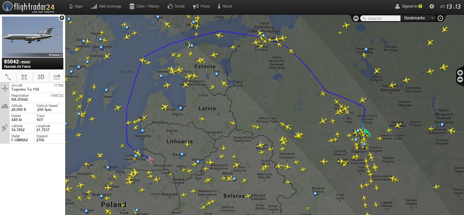 Мелочь, всего лишь маршрут из Москвы в Калининград, но как показательно. И вот думается, если ВВС РФ продолжат вторгаться в воздушное пространство ЕС и кошмарить исключительные экономические зоны своим флотом, то вскоре и вправду, единственной заграницей куда смогут летать россияне стане ...