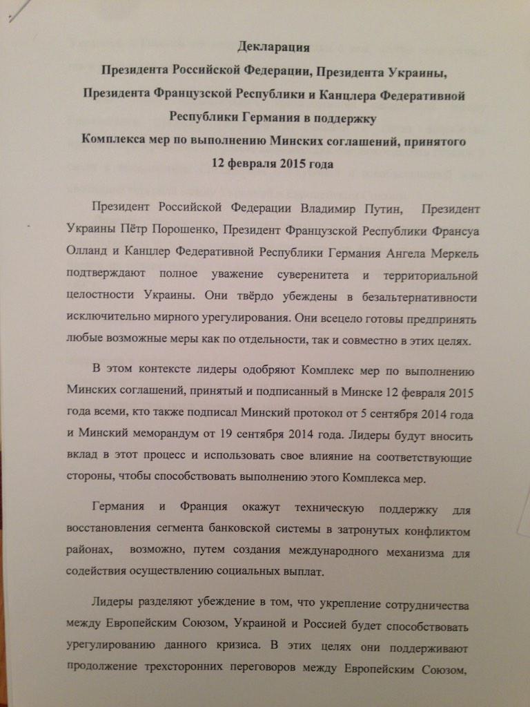 12.15. Заявление президента РФ: "Это не самая лучшая ночь в моей жизни. Но утро, на мой взгляд, доброе..." 1 3.18. Петр Порошенко в своем "Твиттере" (прямо с картинкой) : Украинское информагентство публикует текст подписанного документа. Здесь ссылка. Что было этой но ...