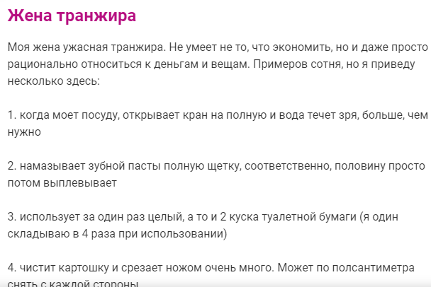 «Жена часто просит денег на косметику. Многие женщины думают, что хороший муж должен обеспечивать жену, что бы она всегда хорошо выглядела. Почему я должен покупать жене косметику, если она краситься только когда идет на работу, к подругам или на какие-то мероприятия?» «Камрады, ...