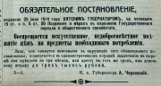 Обязательное постановление, изданное 25 июля 1914 г. вятским губернатором на основании 15 ст. и п.5 ст.26 Положения о мерах к охране Государственного порядка и общественного спокойствия. Воспрещается искусственное, недобросовестное поднятие цен на предметы необходимого потребления. ...
