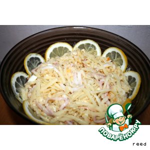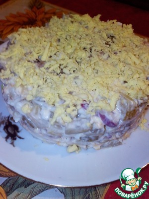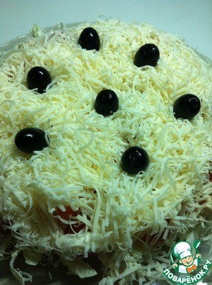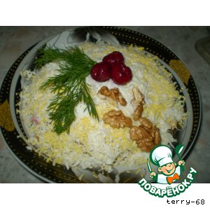 У меня тут снова "Еда на ура". Простите, покупать уж не стал, отфоткал так. Классика сырика энд маянезика - не в духовке, но от этого не легче. Первым номером у нас идет салат с классическим названием "Фантазия". Казалось бы - все тривиально, но тут автор начинает украшать башенками реди ...