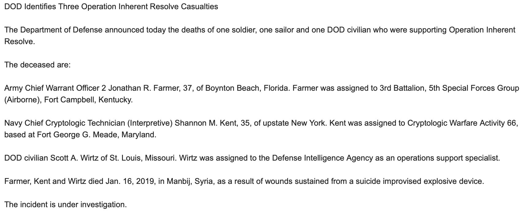 Появились данные по американцам убитых во время взрыва в Манбидже. На заглавной фотографии Скотт Вирц - бывший снайпер из "Морских котиков". Служил в Афганистане, Ираке, Южной Корее, Филиппинах, Африке. После этого ушел работать в военную разведку, успев отработать три командировки на ...