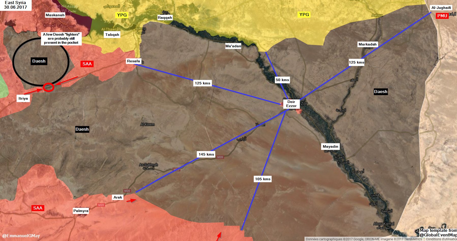 Километраж до Дейр-эз-Зора от передовых позиций сирийской и иракской армий, а также иранских "прокси". От Ресафы - 125 километров. (САА) От Арака - 145 километров (САА + Хэбалла + российские ССО) От Т2- 105 километров (иранские прокси) От Аль-Джуагифи - 105 километров ("Хашд-Шааби"). ...