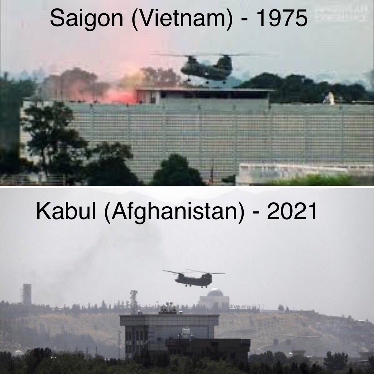 Первое фото - эвакуация из посольства США в Сайгоне. Второе фото - эвакуация из посольства США в Кабуле. Исторические кадры, которыми еще долгие годы будут иллюстрировать период завершения афганской войны. Бегство США из Кабула. Как сообщают очевидцы, в аэропорту Кабула ...