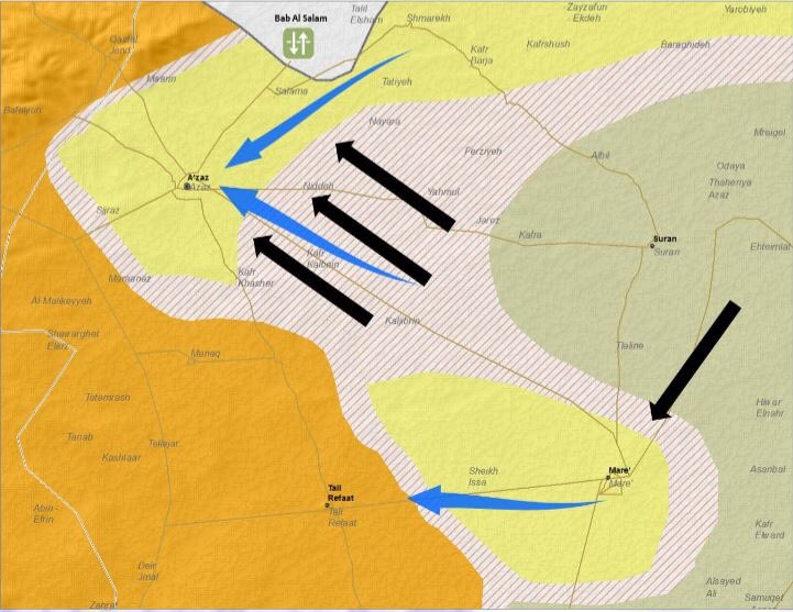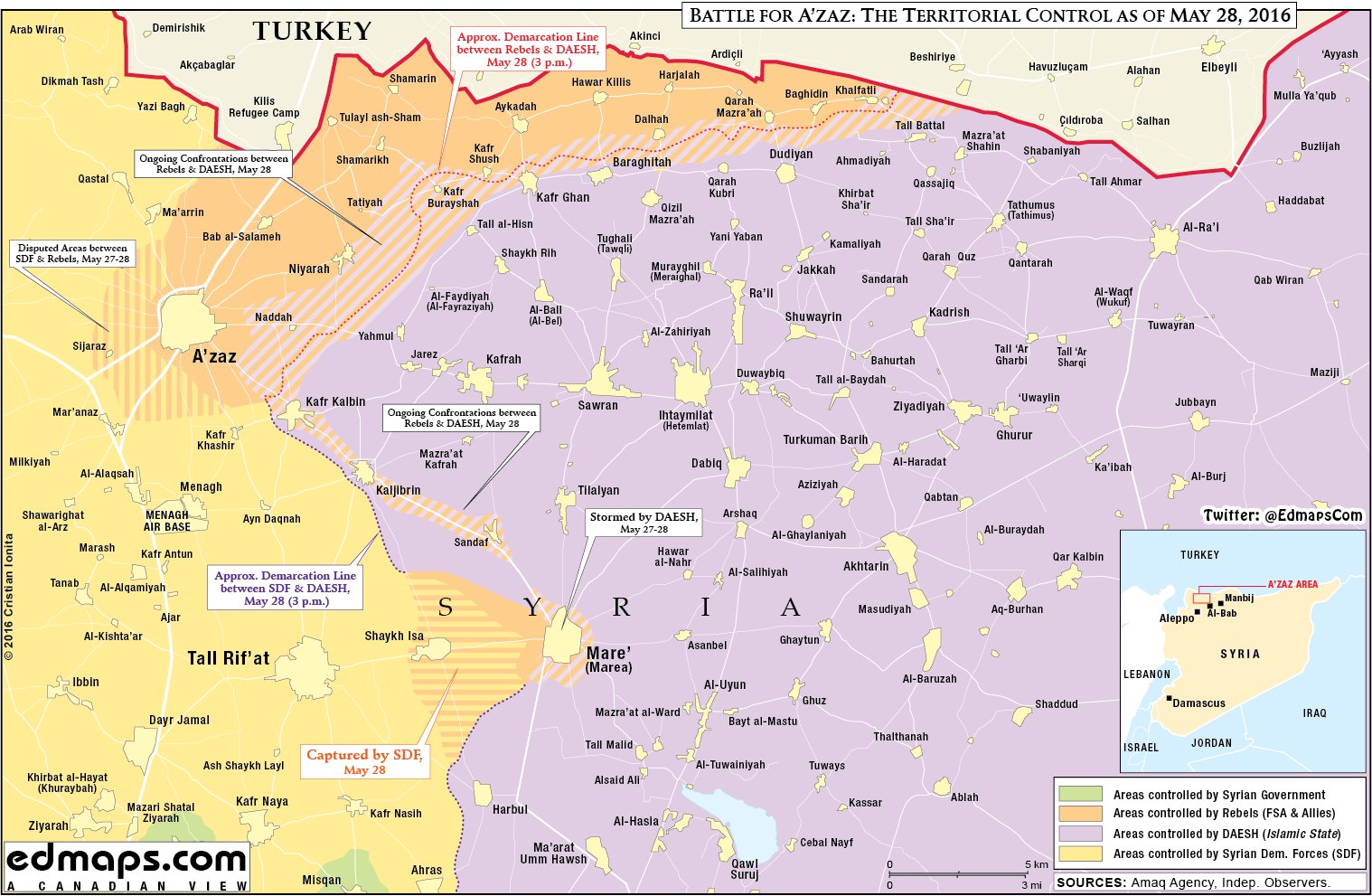 Ситуация под Азазом и Маре продолжает оставаться очень напряженной. С помощью ударов американской авиации и турецкой артиллерии, "зеленые" смогли остановить прямое наступление Халифата на Азаз и отбить несколько деревень к востоку от города. При этом по ряду сообщений, американцы якобы ...