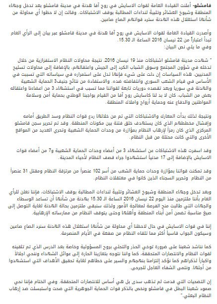 О перемирие в Эль-Камышлы, где несколько дней шли бои http://colonelcassad.livejournal.com/2718004.html между САА и курдами, сообщали еще вчера, но судя по всему реально оно вступило в силу только сегодня. Текст официального перемирия между сирийцами и курдами. Курдские силы безо ...