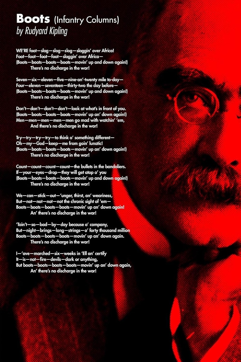 У Киплинга есть стихотворение с идеально выписанным ритмом под названием Boots ("Бутсы", или, в наших реалиях, «Сапоги»). Написано под впечатлением от англо-бурской войны, впервые опубликовано в 1903 году. Это одно из тех стихотворений, что сделали его "солдатским поэтом". We’re ...