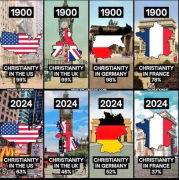 Изменения в численности последователей прежде всего католического христианства в крупнейших странах Западного мира: США, Британии, Германии и Франции, — за период с 1900 по 2024 год. ...