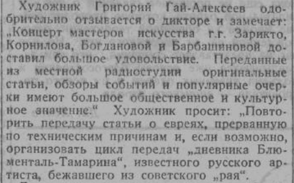Художнику Гай-Алексееву очень нравятся радиопередачи, которые организовали немцы для унтерменшей. Настолько эти передачи его цепляют, что он пишет письма, дабы таки интересные передачи повторили и выражает восторг прослушанным. За родину, № 4, 1942 Надо понимать, что художник ...