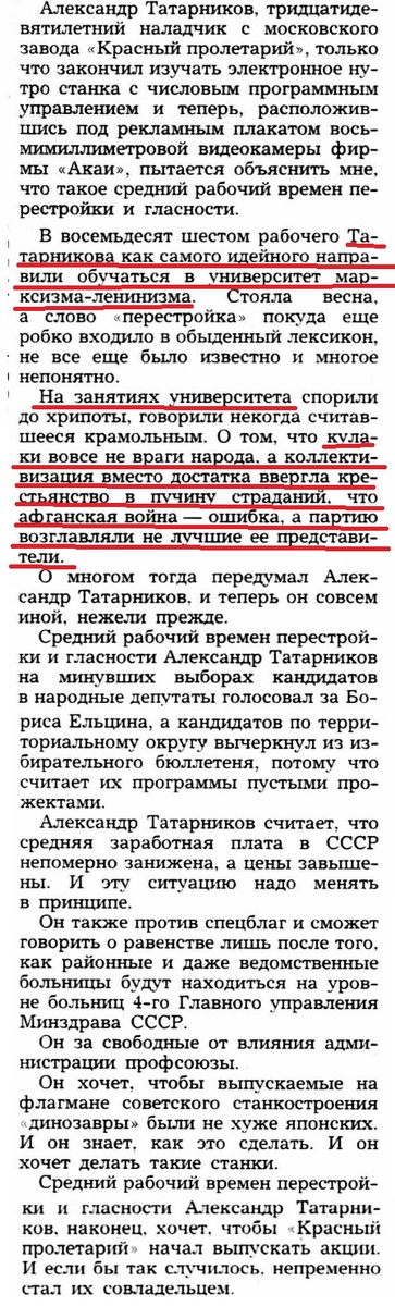 Простой рабочий с завода "Красный пролетарий" в 1986 году был направлен на учебу в университет марксизма-ленинизма. Огонек, № 20, 1989 Получив мощную подготовку и высшее политическое образование Александр Татарников многое захотел изменить в своей жизни и жизни завода. ...